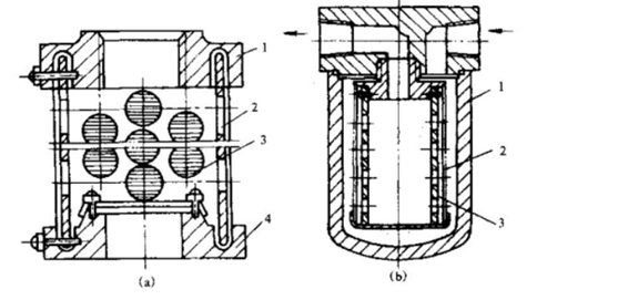 It is composed of a top cover 1, a shell 2, a fine metal wire 3 and a cylindrical skeleton 4, and the residual particles with a diameter of d >0.03~0.1 mm are removed, and the pressure loss is 0.07~0.35 MPa, and the flow capacity is large, but it is not easy to clean. Mesh filters and line-gap filters are surface-type filters, as shown in Figure 5.5.