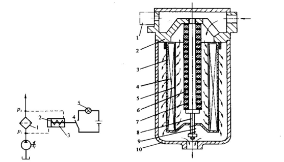 Paper-core filters and sintered filters are depth filters. As shown in Figure 5.7, there is a filter with an alarm mode. The filter element of the sintered filter is sintered by pressing granular bronze powder, filtering out impurity particles with a diameter of d≥0.01~0.1mm, and the pressure loss is 0.03~0.2MPa.